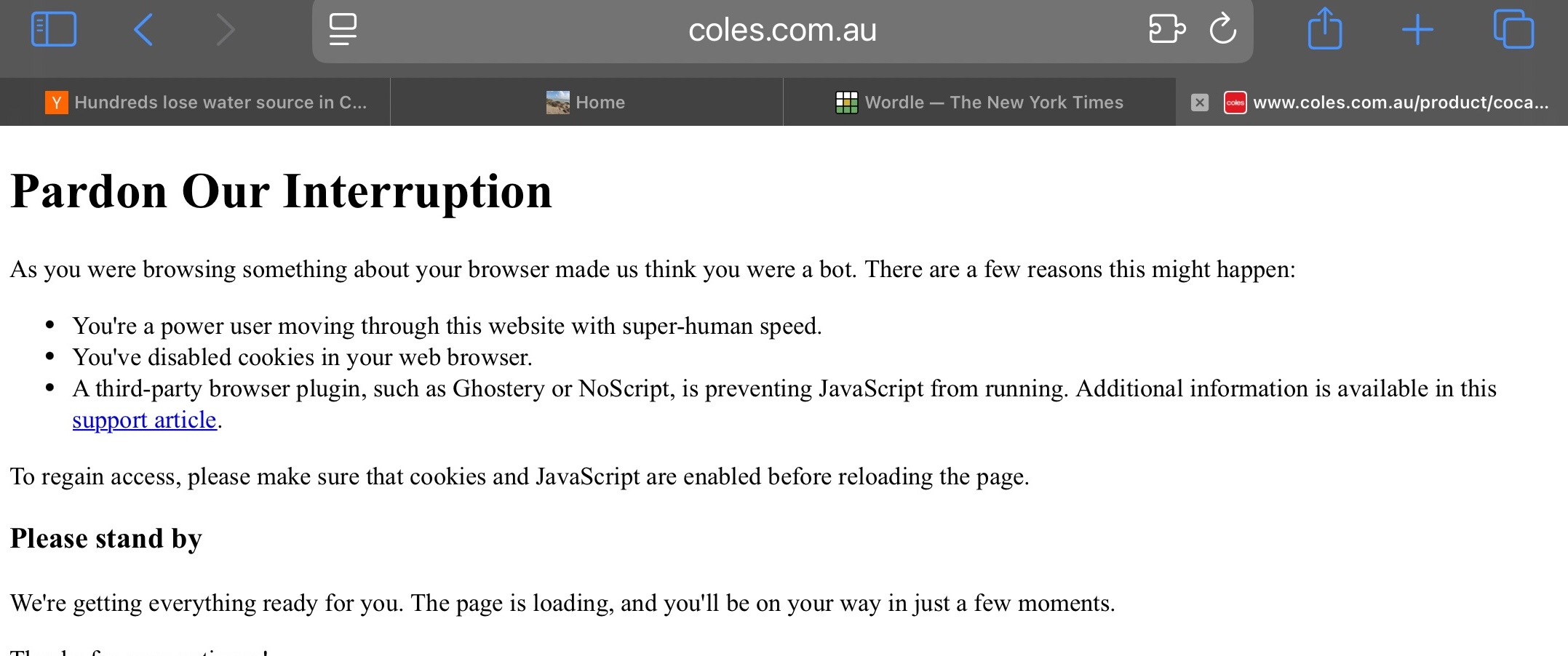 Went to the Coles website and tried to look up the price of something only to greeted by this page. Clearly I am not a bot, cookies are enabled and I dont have any plugins. Simplest way to fix it is to go to the ALDI website.😀